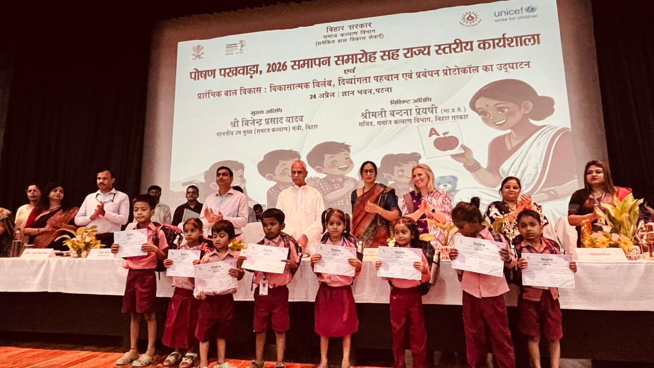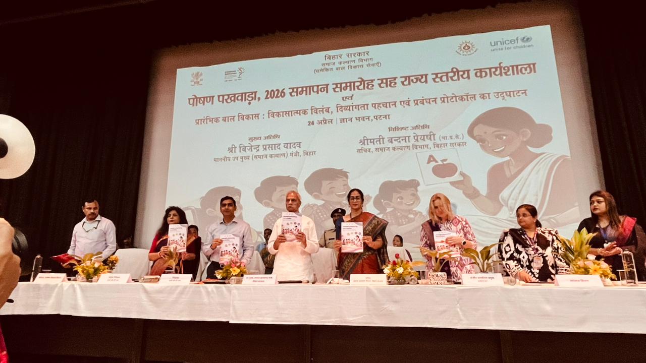 बिहार सरकार के ICDS निदेशालय द्वारा आज ज्ञान भवन, पटना में पोषण पखवाड़ा-2026 का भव्य समापन समारोह आयोजित किया गया। इस अवसर पर यह घोषणा की गई कि पोषण माह-2025 की सफलता को दोहराते हुए बिहार एक बार फिर राष्ट्रीय स्तर पर प्रथम स्थान पर पहुँच गया है। कार्यक्रम में माननीय उपमुख्यमंत्री (समाज कल्याण) मुख्य अतिथि के रूप में शामिल हुए।