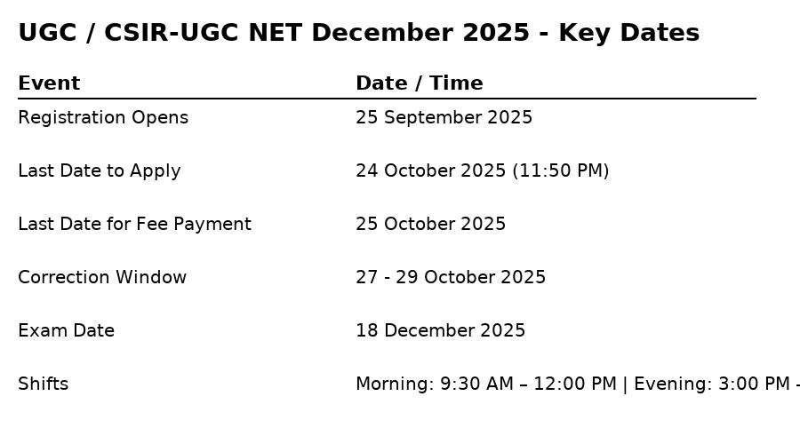 The National Testing Agency (NTA) has officially released the notification for the UGC-NET December 2025 examination. The registration process began on October 7, 2025, and will continue till November 7, 2025, through the official website ugcnet.nta.nic.in. Candidates will be allowed to make corrections in their submitted forms between November 10 and 12, 2025, as per the NTA schedule. The exam is scheduled to take place from December 31, 2025, to January 7, 2026, in Computer Based Test (CBT) mode across multiple cities in India.